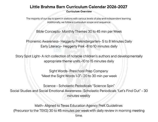 Little Brahma Barn Christian Preschool uses a proprietary curriculum format created by our founder, Jacqueline Traweek. At the beginning of each year we will give a "scope and sequence" which provides a general outline of what will occur each month. This is created based on the Preschool Guidelines from Texas Education Agency. Each month, all three classrooms will have a guideline for learning.